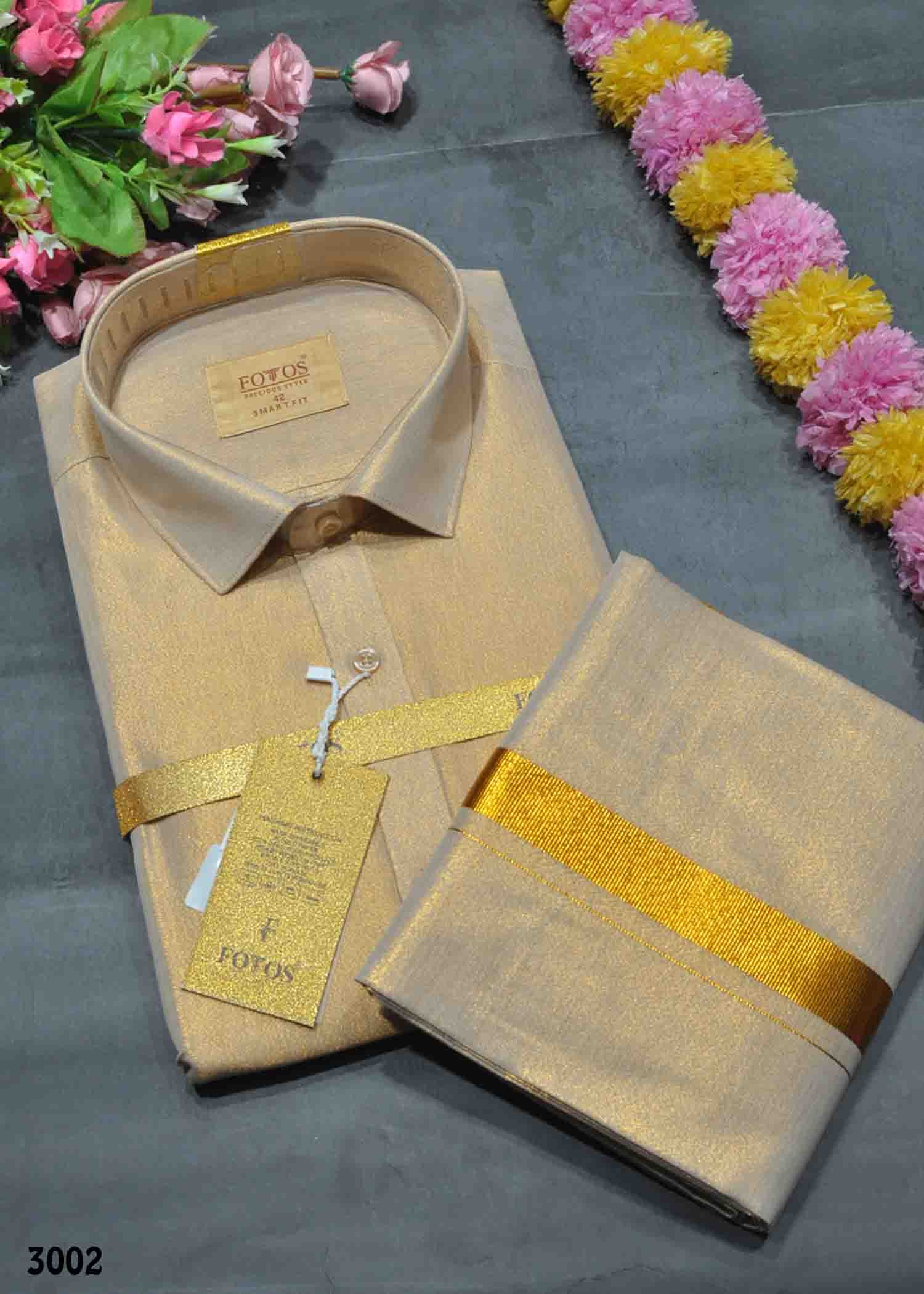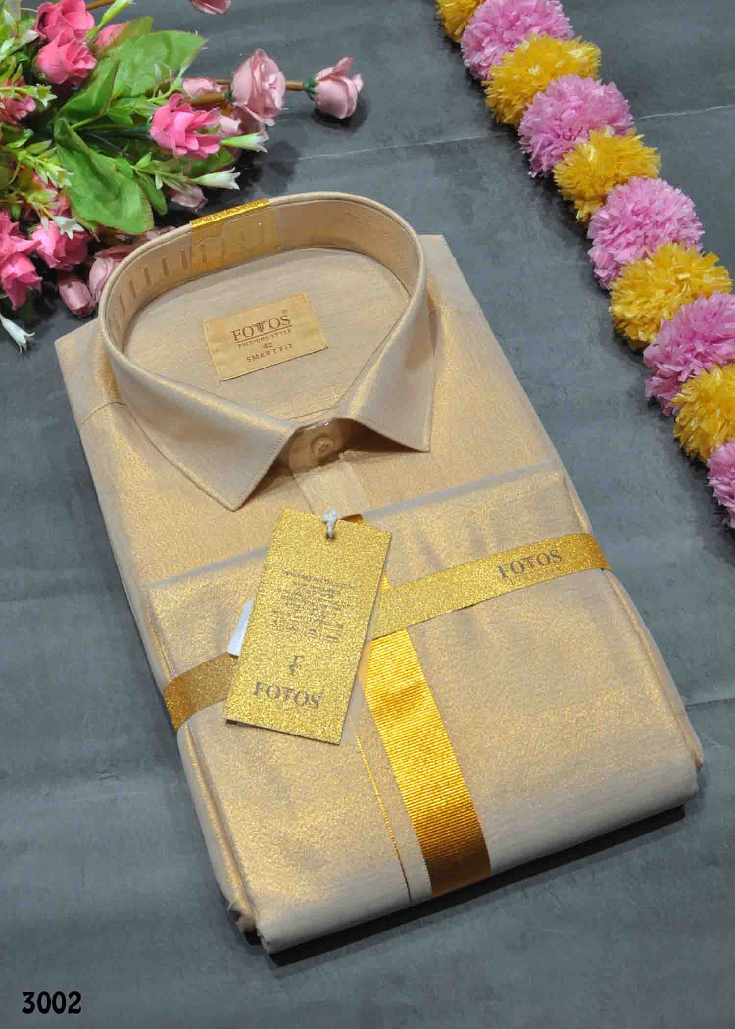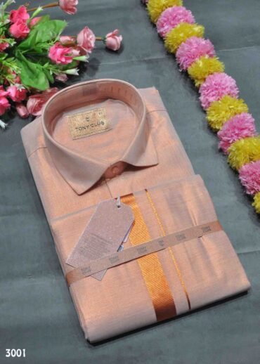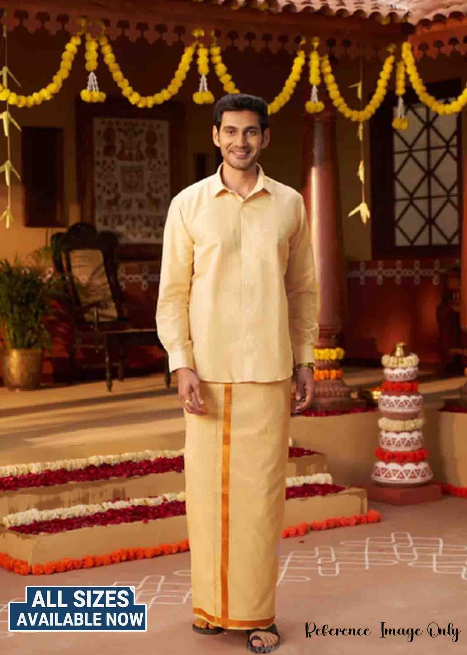 | Occasion : Traditional Look Wedding & Festival Fabric : Tissue Color : Copper Shirt : Full sleeves / Collared Neck Dhoti : Jari Border ( 2 Mtr / 4 muzham) Shirt Size : (36, 38, 40, 42, 44) Weight : 660 Grams Wash : Shampoo Wash |