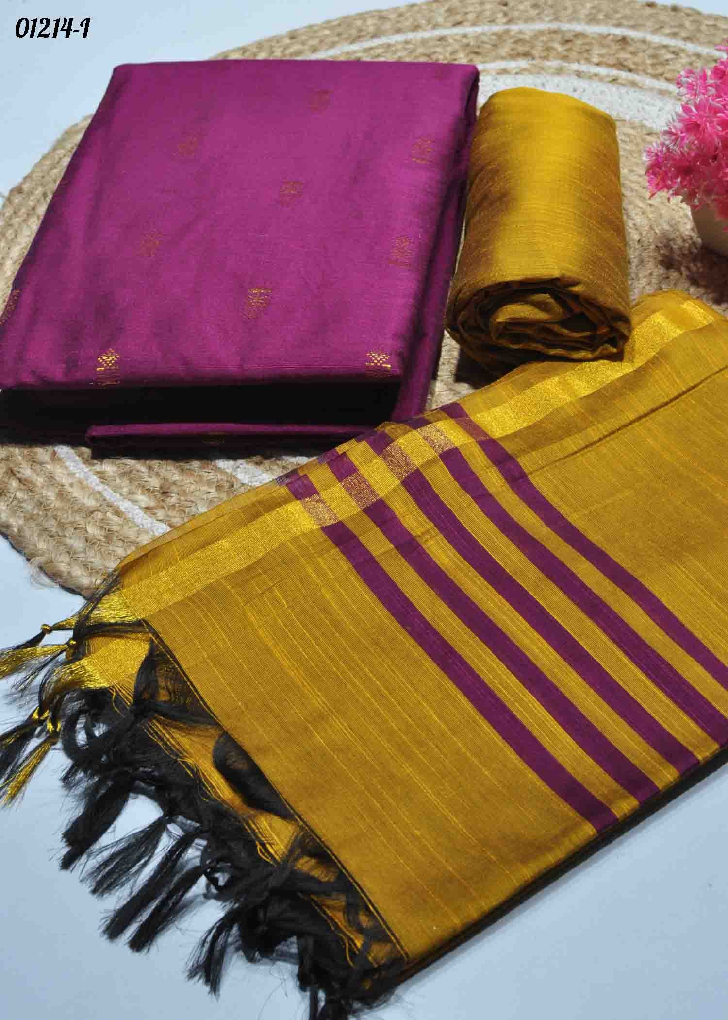 | Occasion : Festival Top : Purple Color Dupion Silk Salwar Material (2.20 METER) Bottom : Mustard Color Dupion Silk Material (2.20 METER) Shawl : Mustard Color Chanderi Silk Shawl (2.20 METER) Weight : 800 Grams Work : Nykaa Butta & Tassels Wash : Normal Wash |