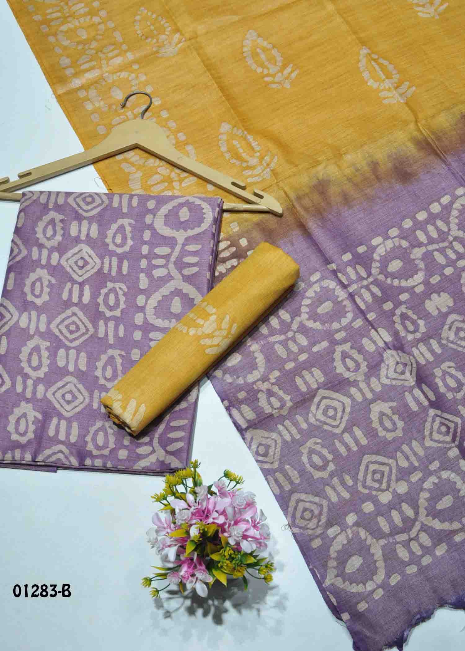 | Occasion : Festival Top : HeatherPurple Color Batink Cotton Salwar Material (2.20 METER) Bottom : Yellow Color Batik Cotton Material (2.20 METER) Shawl : Purple With Yellow Color Batik Cotton Shawl (2.30 METER) Weight : 590 Grams Work : Batik Printed & Tassels Wash : Normal Wash |