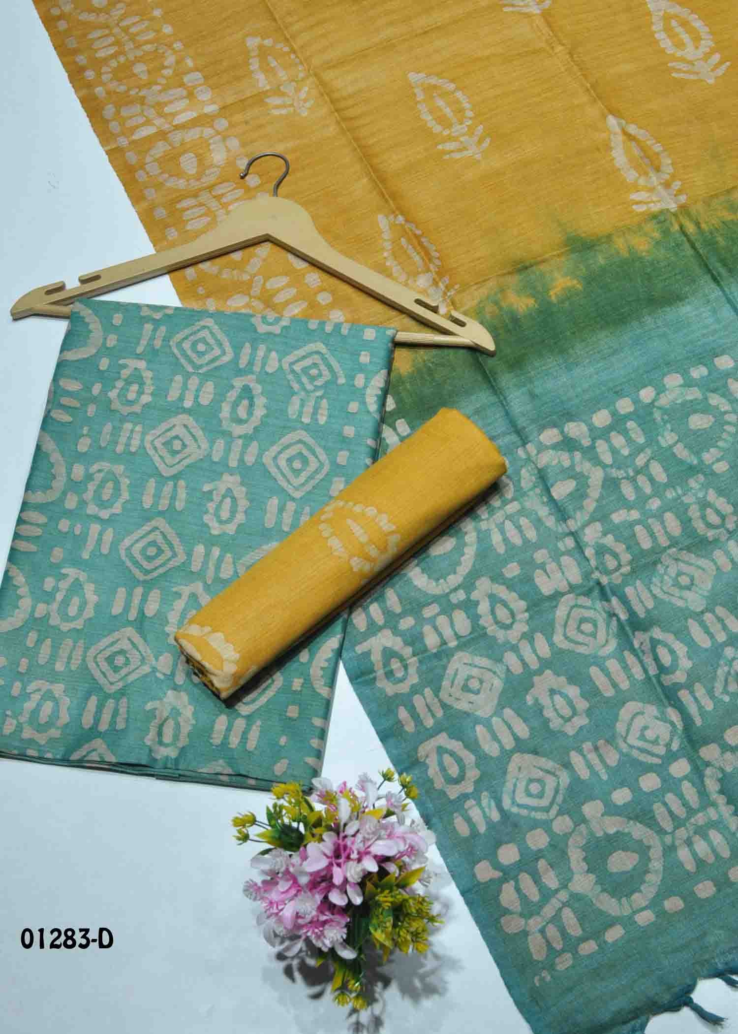 | Occasion : Festival Top : Cyan Color Batink Cotton Salwar Material (2.20 METER) Bottom : Yellow Color Batik CottonMaterial (2.20 METER) Shawl : Cyan With Yellow Color Batik Cotton Shawl (2.30 METER) Weight : 590 Grams Work : Batik Printed & Tassels Wash : Normal Wash |