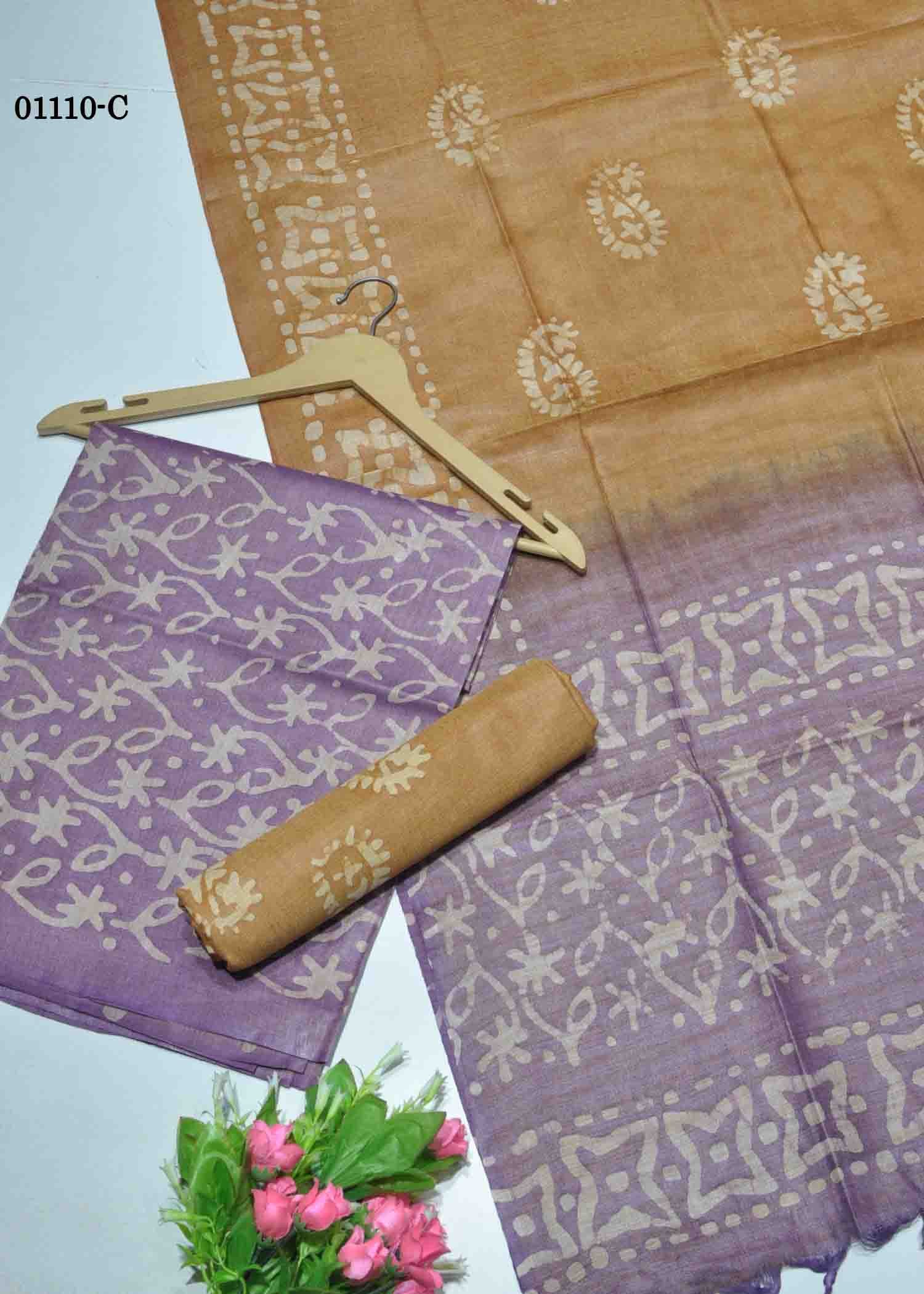 | Occasion : Festival Top : Purple Color Batink Cotton Salwar Material (2.20 METER) Bottom : Tan Color Batik Material (2.20 METER) Shawl : Tan With Purple Color Batik Cotton Shawl (2.30 METER) Weight : 590 Grams Work : Batik Printed & Tassels Wash : Normal Wash |