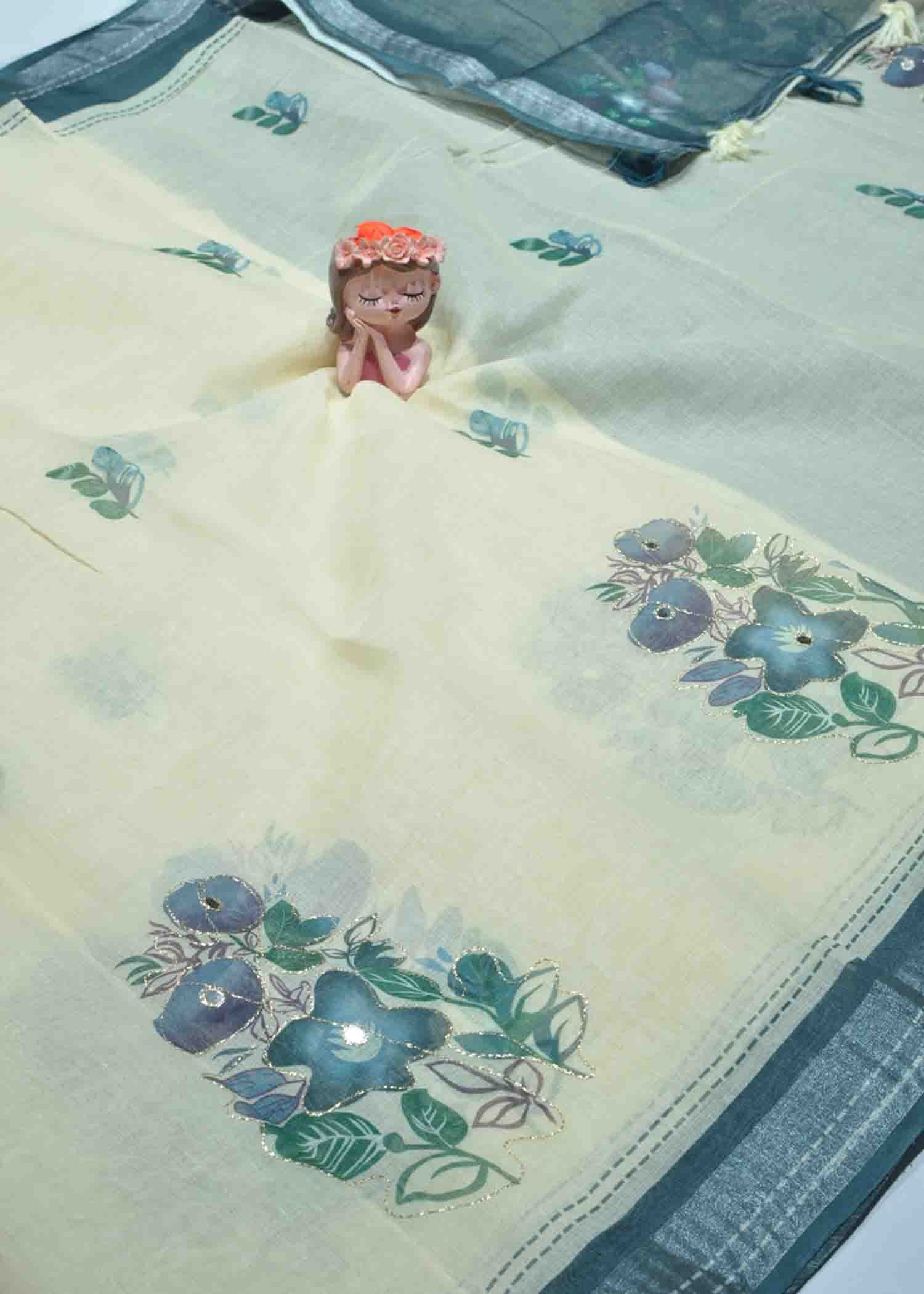 Tannishtha -10289-A Halfwhite With PeacockBlue Color Trendy Linen Cotton Saree CM1310582 [LR4E]