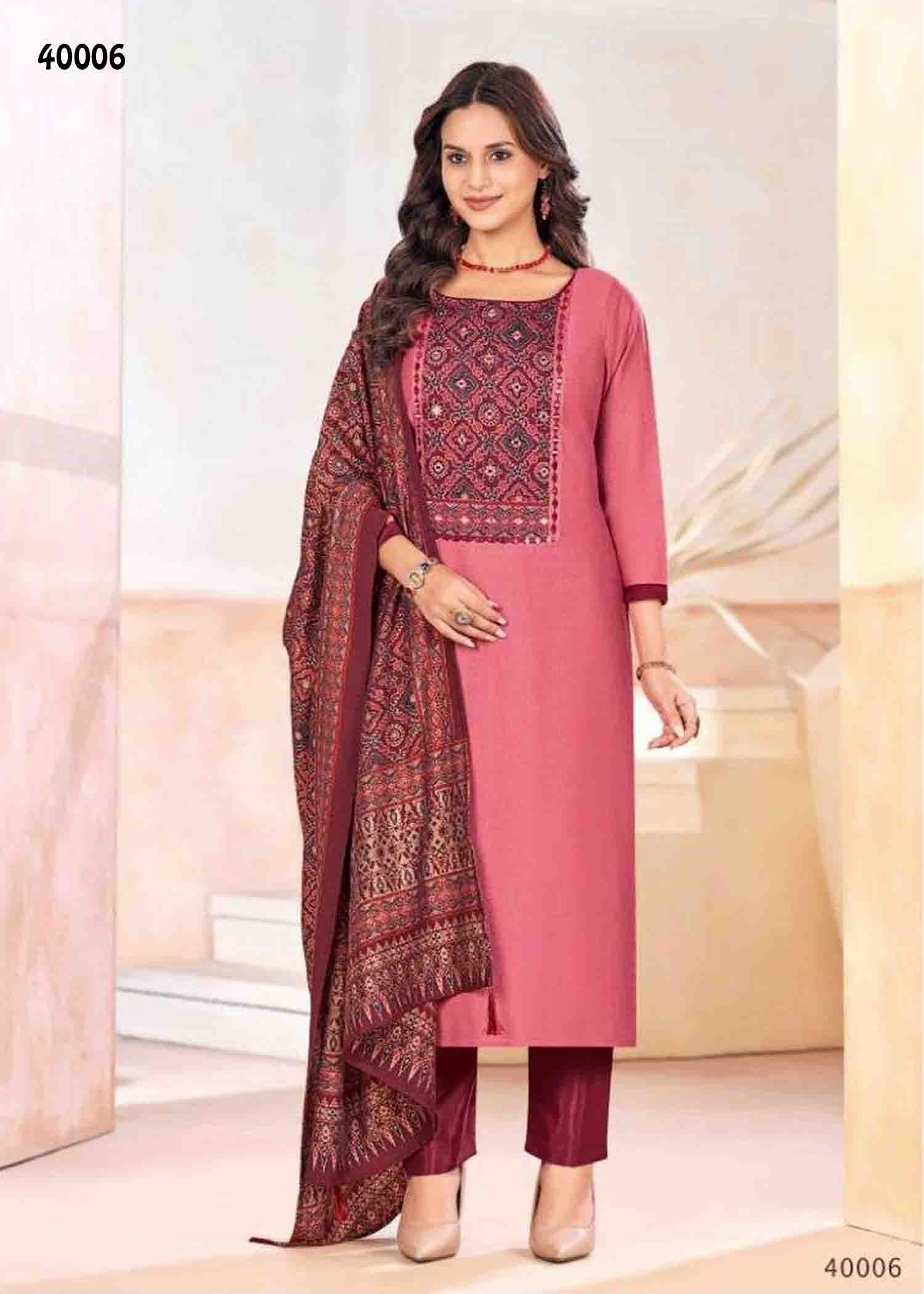 | Occasion : Festival Top : CandyPink Color Vetican Silk Salwar Material (2.20 METER) Bottom : Maroon Color Dull Santoon Material (2.10 METER) Shawl : Maroon Color Ajjrak Print Shawl (2.20 METER) Weight : 620 Grams Work : Ajjrak Print & Mirror Wash : Normal Wash |