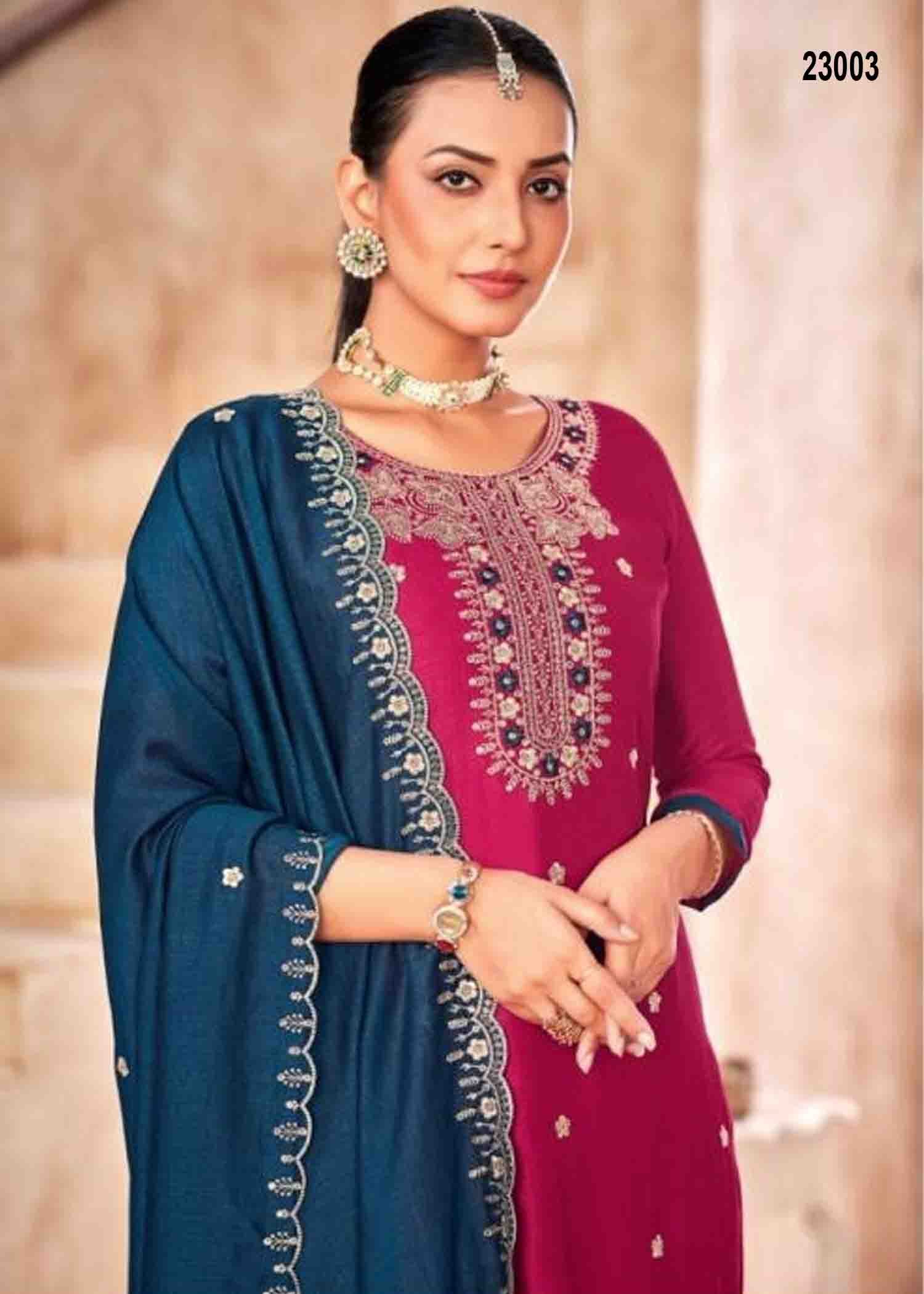 | Occasion : Festival Top : Dark Pink Color Vichitra Silk Salwar Material (2.20 METER) Inner : Dark Pink Color Dull Shantoon Material (1.90 METER) Bottom : PeacockBlue Color Dull Shantoon Material (1.90 METER) Shawl : PeacockBlue Color Vichitra Work Shawl (2.20 METER) Weight : 630 Grams Work : Embroidery & Sequence Wash : Normal Wash |