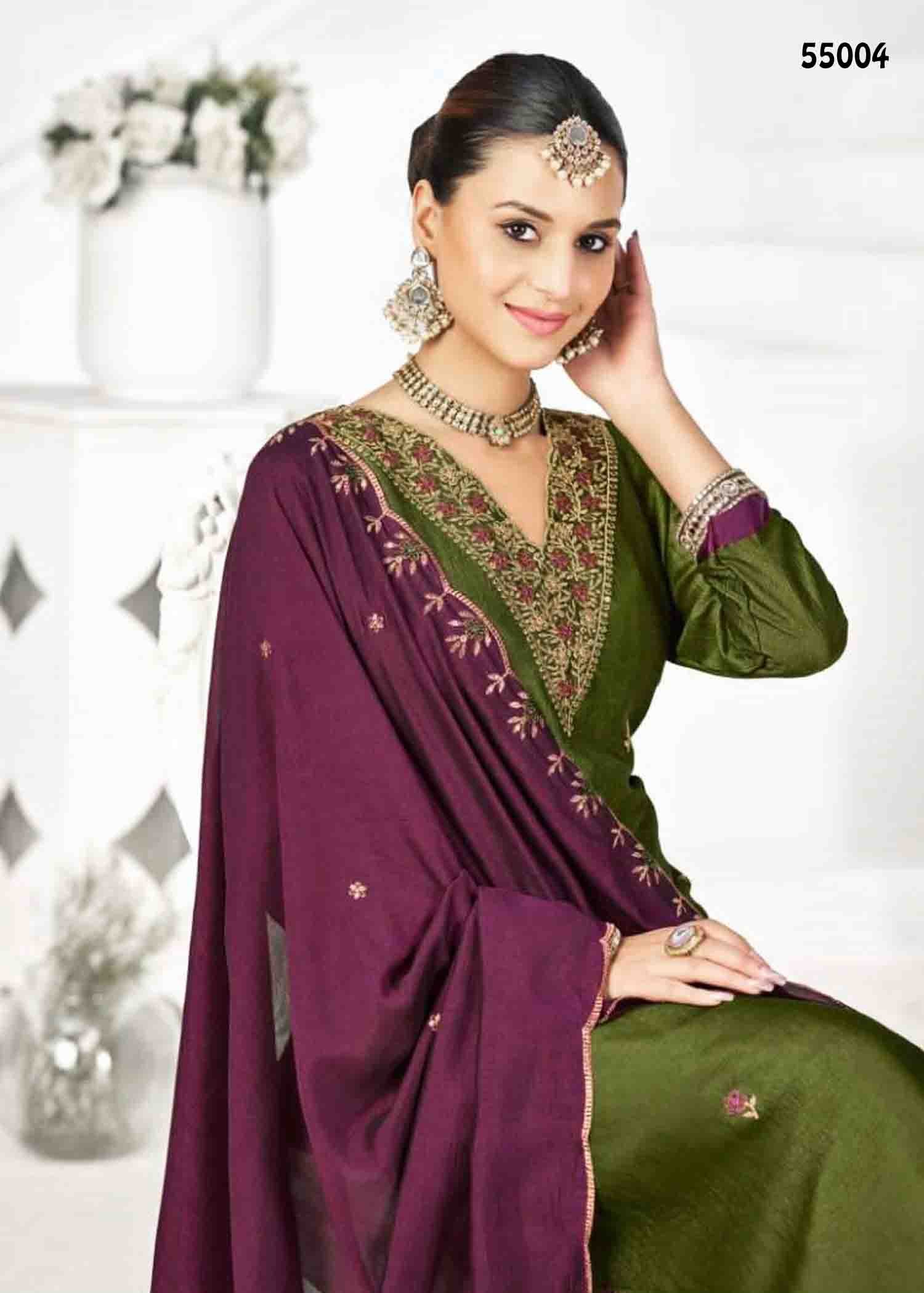 | Occasion : Festival Top : OliveGreen Color Vichitra Silk Salwar Material (2.20 METER) Bottom : Purple Color Shantoon Material (2 METER) Shawl : Purple Color Vichitra Work Shawl (2.10 METER) Weight : 640 Grams Work : Embroidery Wash : Normal Wash |