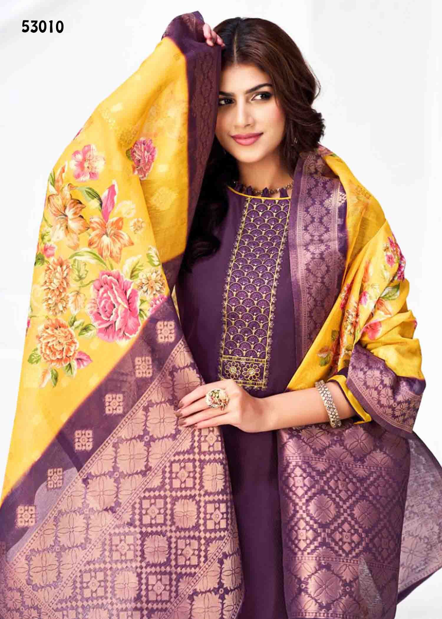 | Occasion : Festival Top : Purple Color Gadwal Silk Salwar Material (2.20 METER) Bottom : Yellow Color Dull Shantoon Material (2.20 METER) Shawl : Yellow Color Chanderi Jacquard with Digital Shawl (2.20 METER) Weight : 530 Grams Work : Embroidery Wash : Normal Wash |